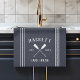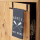 Customize your lake house kitchen with this cute personalized towel featuring your family name or house name and year established in white lettering accented with a pair of oars on a rich navy blue background.