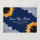 Elegant and romantic navy blue floral wedding save the date postcard featuring sunflower flowers and white floral lace against a burlap background.
