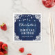Elegant navy blue rustic bridal shower paper napkins featuring a rustic wood background adorned with string lights and white floral lace.