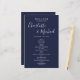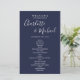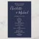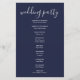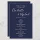 Elegant navy blue signature script wedding welcome program featuring signature style names. Personalize with your wedding details in modern white lettering. Designed by Thisisnotme©
