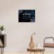 The corners of this elegant wedding poster are decorated bouquets of navy flowers trimmed with silver faux foil foliage. Customize the text in silver gray handwriting script and serif fonts on a navy blue watercolor agate background.