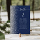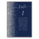 The left-hand edge of this elegant modern wedding table number card features a silver faux glitter border. The word "table" appears in silver gray whimsical handwriting script on a navy blue background. Add the names of your guests who are assigned to each table.