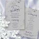 These wedding programs are elegant and tasteful, while still being budget friendly. The design features ornate silver gray faux foil lace with navy blue colored text on a gray background. The typography features lacy script calligraphy, and there is room for details on the ceremony, the bridal party, and a short thank you.