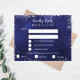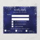 A navy blue background, the blue color is uneven. Decorated with faux silver glitter, sparkles. Personalize and add the reply by date and dinner menu choises.