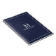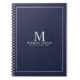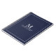 Professional notebook features custom monogram, name and text in grey classic serif font style with silver border on navy blue background.