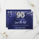 A modern and elegant Save the Date for a 90th birthday part. A navy blue background decorated with faux silver stars. Personalize and add a date and name. The blue color is uneven. The text: Save the Date is written with a large trendy hand lettered style script.