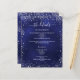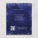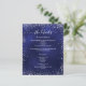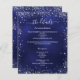 A modern, elegant wedding program/details/timeline. A navy blue colored background decorated with faux silver glitter sparkles. The blue color is uneven. Personalize and add your names and wedding details. White colored letters.
