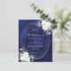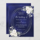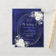 A blue, uneven colored background. An oval faux silver frame decorated with watercolored white florals, roses. Personalize and add your names, details. White text.