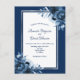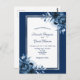 On front: A navy blue background with a simple faux silver and white frame. Decorated with blue flowers, roses. Templates for Your names and wedding details. The names are written with a hand lettered style script, blue colored letters.