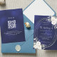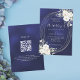 A blue, uneven colored background. An oval faux silver frame decorated with watercolored white florals, roses. Personalize and add your names, details. White text.