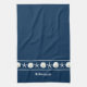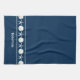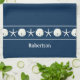 Perfect for coastal bathroom décor, this personalized beach themed kitchen towel features a row of white sand dollars and starfish, with the name underneath, on a navy blue background.