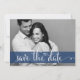 A modern and stylish save the date card featuring whimsical calligraphy script and navy blue and white stripes. A Matching thank you card is available.