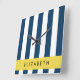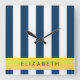 Navy Blue Stripes, Striped Pattern, Your Name Square Wall Clock