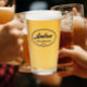 Beer glass for the wedding groomsman that features his name printed in a trendy, navy blue, stylized script inside a navy blue color oval border along with wedding year date. A great party supply idea for a bachelor party! Personalize your beer glass by editing and replacing name and date with your own. Available in many, popular wedding color schemes.