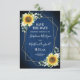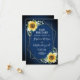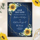 These save the date cards feature a watercolor floral design with sunflowers and white flowers with eucalyptus foliage on a navy blue wood grain background with a faux gold geometric frame. Personalize these cards with your own text. These cards are part of a collection which includes other wedding items. Please view the collection page or visit our store to see the full range.