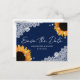 Rustic navy blue and yellow floral wedding save the date postcard featuring sunflowers and burlap adorned with white floral lace.