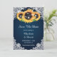 Navy blue rustic floral wedding save the date cards featuring sunflowers on a navy blue background adorned with white floral lace and string lights. Matching items available.