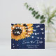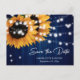 Rustic navy blue wedding save the date postcard featuring sunflowers and string lights on a barn wood background ideal for a rustic navy blue wedding party inspired by sunflower flowers.