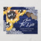 Personalized navy blue and sunflower wedding save the date card featuring sunflower flowers against a rustic wood background adorned with burlap hearts and white floral lace. Our rustic floral wedding save the date card is perfect for a navy blue rustic country, backyard, or barn wedding party inspired by sunflowers.