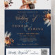 A modern all in one QR code wedding invitation combining elegance and functionality, making this an excellent choice for planning your wedding. The pampas grass floral elements in terracotta, rust, burnt orange and autumn cottage hues against rich navy blue, set the tone for a truly romantic, unforgettable celebration. Add the URL of your wedding website which will update the QR code, (or delete it if not required). Guests can simply scan the QR code to access a wealth of information on your wedding details, updates, etc. Keep or replace the romantic couple if desired. Click on personalise/customise for further editing.