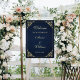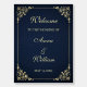 Art deco frame wedding sign on navy blue textured background. Elegant wedding decoration welcome sign.
