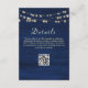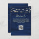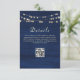 Boho, elegant, gold string lights on rustic wood navy blue wedding details card with QR code for more information.