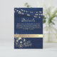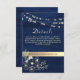 Elegant, modern, rustic wood navy blue wedding details card with website, vintage gold floral lace and string lights.
