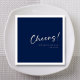 Elevate your wedding reception with these sophisticated and stylish navy blue wedding napkins featuring a stunning silver-colored "cheers" design. These high-quality cocktail napkins are perfect for adding a touch of elegance to your wedding tables.