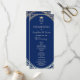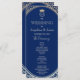Simple, modern, elegant, calligraphy navy blue wedding program with gold art-deco frame and royal monogram at the top.