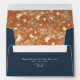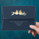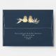 Elegant, modern, navy blue 5x7 envelopes for wedding invitations with return address, love birds and faux gold floral lace inside.