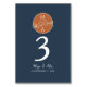 Simple, modern, elegant orange terracotta and navy blue wedding table number with monogram.