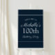Navy blue and white custom 100th birthday party foam core easel sign for a woman's celebration. Text is an elegant calligraphy script font. Contact me for assistance with customization or to request matching products.