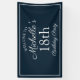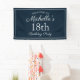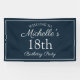 Modern navy blue and white 18th birthday party banner for a woman's birthday party celebration. Text is an elegant calligraphy script font. Contact us for help with customization or to request matching products.