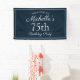 Navy blue and white 75th birthday party banner for a woman's celebration. Text is an elegant calligraphy script font. Contact us for help with customization or to request matching products.