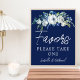 Bold navy blue and white peony floral evening favors poster for a modern winter wedding. An elegant botanical spray of green leaves unfolds above trendy handwritten white script for a gorgeous modern event sign for your event. Please take a favor.