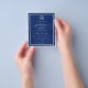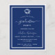 A modern, elegant invitation. A navy blue background decorated with white frames and a white cap. Personalize and add a name and party details. White text.
