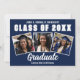 This modern navy blue and white custom senior graduation announcement photo collage card features your high school or college portrait pictures for the class of 2025. Customize with your graduating year under the bold handwritten script and grad cap for a great personalized graduate announcement.