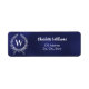 Navy blue background. The blue color is uneven. Decorated with a wreath. Personalize and add your name, address and family monogram initial. White text.