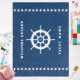 Navy blue and white nautical boat wheel with stars stripes and customizable boat name in white.