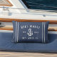 Add a cool custom touch to your fishing boat, sailboat, yacht, or houseboat with this personalized pillow. Rustic nautical design features your boat name, ship's registry, and year established in white lettering, with an anchor illustration and rope stripe detailing on a classic navy blue background.