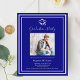A navy blue background, decorated with a white frame, and a graduation cap. Personalize and add a photo name and details. White text.