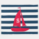 Navy blue and white striped fleece blanket decorated with a red boat and personalized with your monogram initial. You can also remove the monogram if you choose. Perfect for vacation rentals or beach homes.