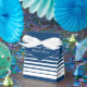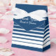 Personalized wedding favor box. Navy blue and white stripes. Custom thank you message from bride and groom. Cute polkadot print with elegant white ribbon bow. Customizable background color. Nautical maitime theme design.