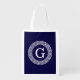 Navy Blue Wht Greek Key Rnd Frame Initial Monogram Grocery Bag
