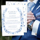 Elegant romantic navy blue wildflower wreath, tiny flower garden, barn or ranch wedding details card.