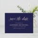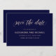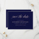 These simple and minimal wedding save the date invitations feature blush pink calligraphy on a navy blue background.