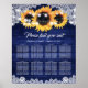 Complement your rustic navy blue wedding party with this elegant seating chart for 8 tables featuring sunflower flowers on a rustic wood background adorned with delicate floral lace and string lights. Matching items available.