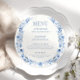 Indulge in vibrant elegance with our rustic spring/summer wedding menu card. Featuring a wreath of blue flowers and delicate blue text.