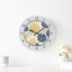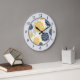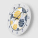 Here's a pretty graphic style pattern clock that looks great in a kitchen, sun room, or really any room in the house. It features a navy blue and yellow gold flower pattern as the center. Around the perimeter is a matching light gray frame with navy blue numbers. Be sure to see the matching products in our store. *Graphic Design credit to Malachi Designs on Etsy.