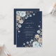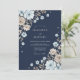 Delicate blossoms and leafy accents in soft blues, creams, and taupes cascade across a deep navy background. This design evokes a romantic and whimsical feel, perfect for a sophisticated celebration. The floral arrangement suggests a blend of anemones and subtle filler blooms.